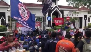 KARAWANG JurnalPurwasuka.com | Ribuan buruh di Karawang, Jawa Barat, menggelar aksi demonstrasi di depan kantor Bupati Karawang pada Rabu (12/11/2025)